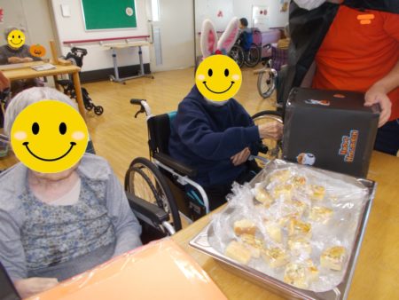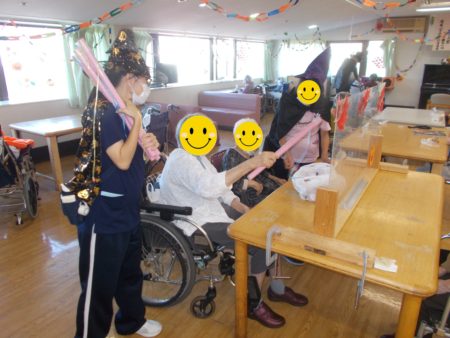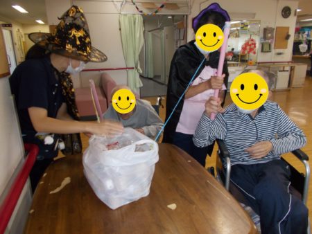 ハロウィンでは本場のハロウィンと同じように仮装した職員からお菓子をもらうのですが、簡単には手に入りません。箱の中に上手くお菓子を投げ入れたり袋にクリップのついたお菓子を磁石の付いた竿で釣り上げるなどしなければもらえませんが皆さん上手にお菓子をGETされました。その後利用者様にも仮装していただきハロウィンパーティーを楽しんでおられました。また運動会では赤組、白組に分かれて玉入れ、ピン球送り、借り物競争、靴飛ばしをし、白熱した運動会となりました。皆さんスポーツの秋を体感されていました。
