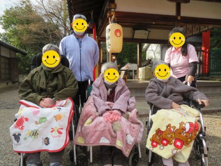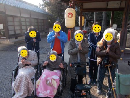 毎年恒例の初詣に参りました。施設から徒歩で10分程の所にある神社へ行きました。少し肌寒い気候でしたが天気は晴れており外出日和となりました。
